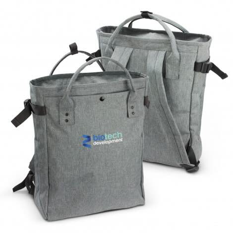 Extra-large tote bag that can also be worn as a backpack. The bag is manufactured from 300D polyester with a two-tone heather style finish. Newport features a zippered top closure, a front slip pocket with a domed closure, and a zipper to access the main compartment from the back of the bag. The bag has a gusset for increased storage, adjustable side straps and padded shoulder straps and carry handles that are riveted to the bag for added strength.
