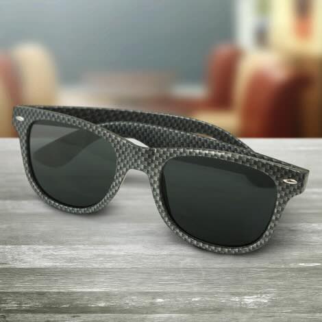 Retail quality sunglasses with an impact-resistant polycarbonate frame and arms. Both the frame and arms are finished with a stylish carbon fibre pattern. They are fitted with CE standard 100% UV400 lenses which provide both UVA and UVB protection. Malibu can be presented in a microfibre pouch for an additional cost.