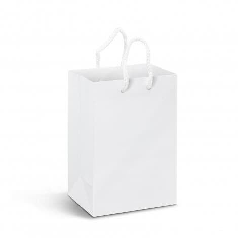 Small paper carry bag with strong woven polypropylene rope handles. It is manufactured from gloss laminated 157gsm art paper and can be branded with stunning edge-to-edge spot colour or full colour printing on all sides including the base. A production lead time of 35 working days applies to this product by air freight and larger orders can be sea freighted on request to reduce the freight cost.
