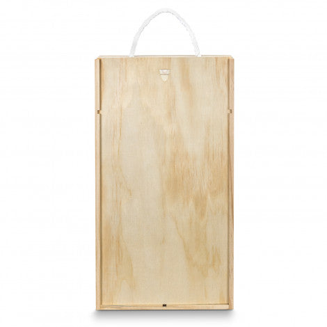 Elegant wine gift box made from natural pine wood with a sliding lid that offers a large branding area. The box is designed to hold two standard wine bottles and has built-in dividers with shredded paper filling. A woven cotton rope handle makes it easy and comfortable to carry.