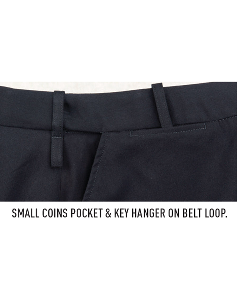 Flexi waist. Above knee length. Two sideÊand one small coins pocket. Key hangerÊon belt loop.