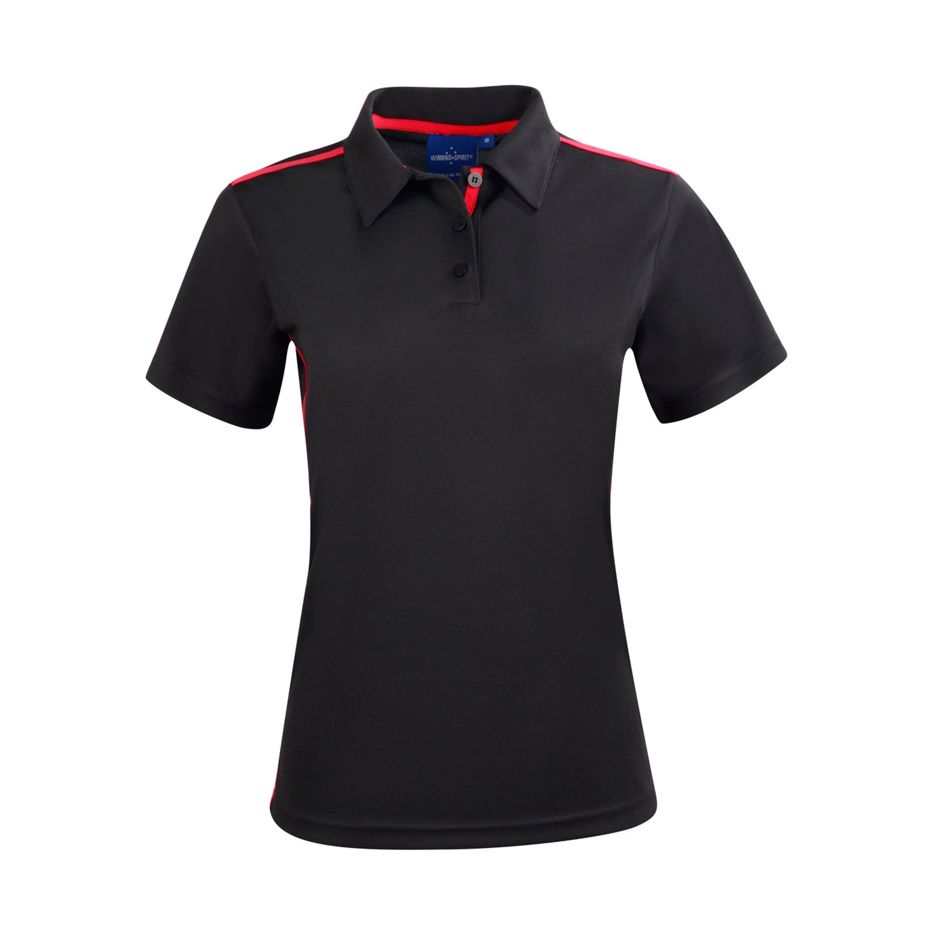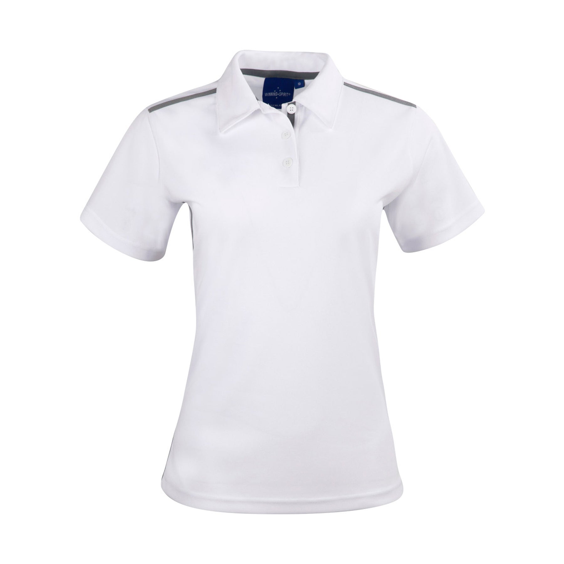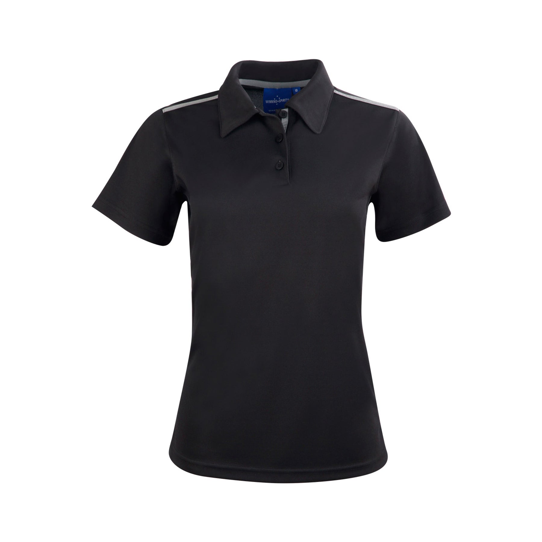 Description: Fine pique fabric with contrast stretch tapes onshoulders, inner placket and body sides, selffabric collar. UPF 30+ UV protection.